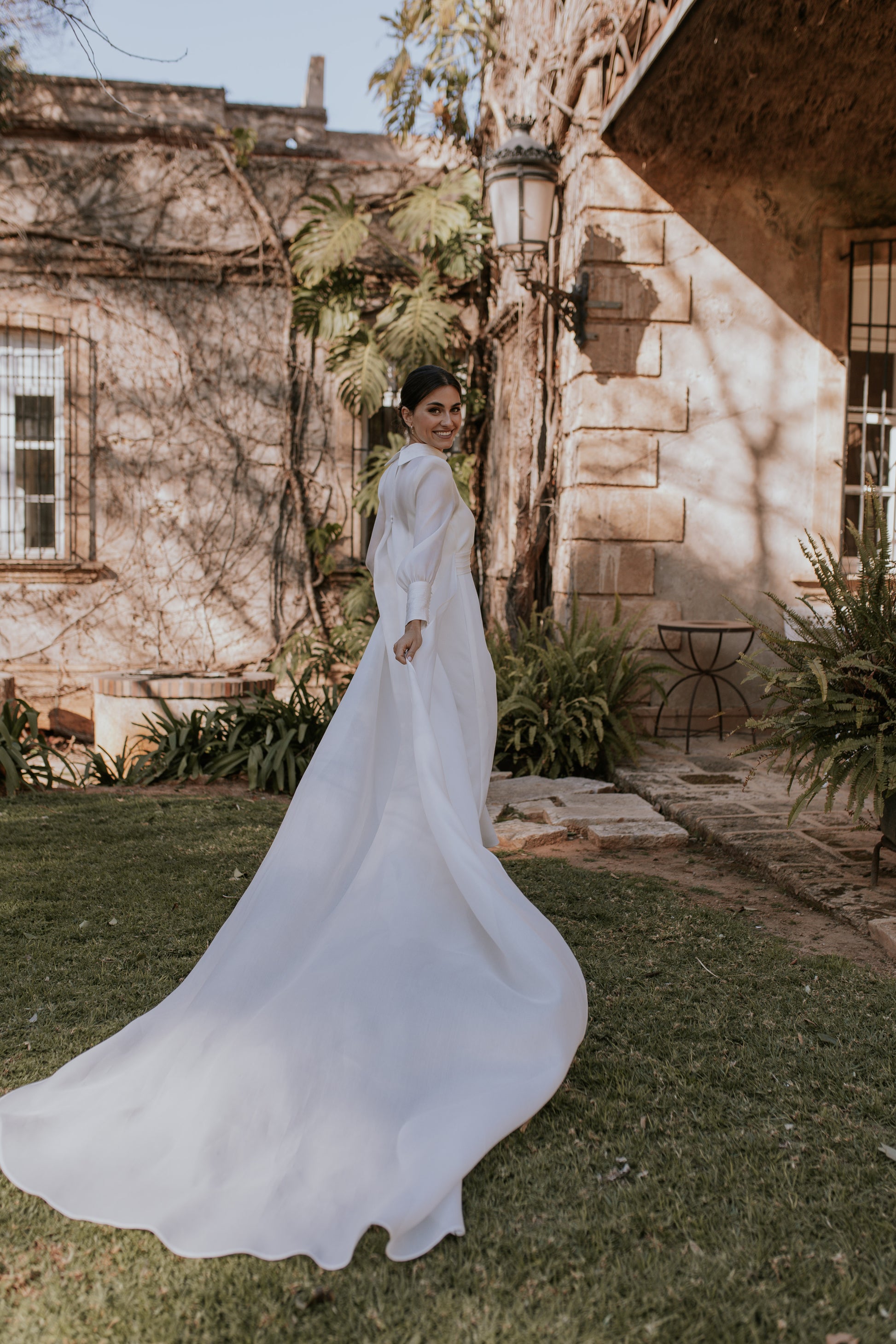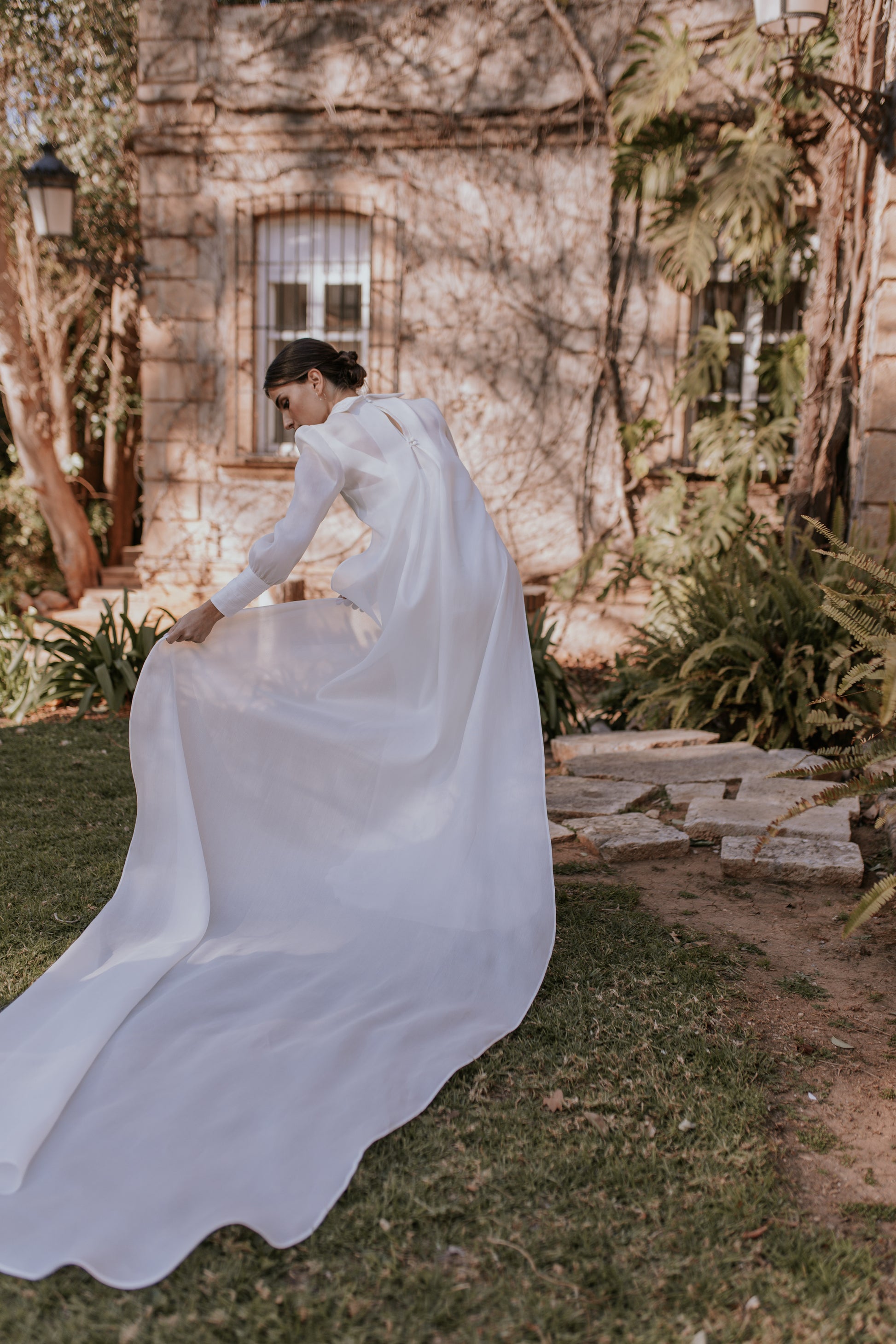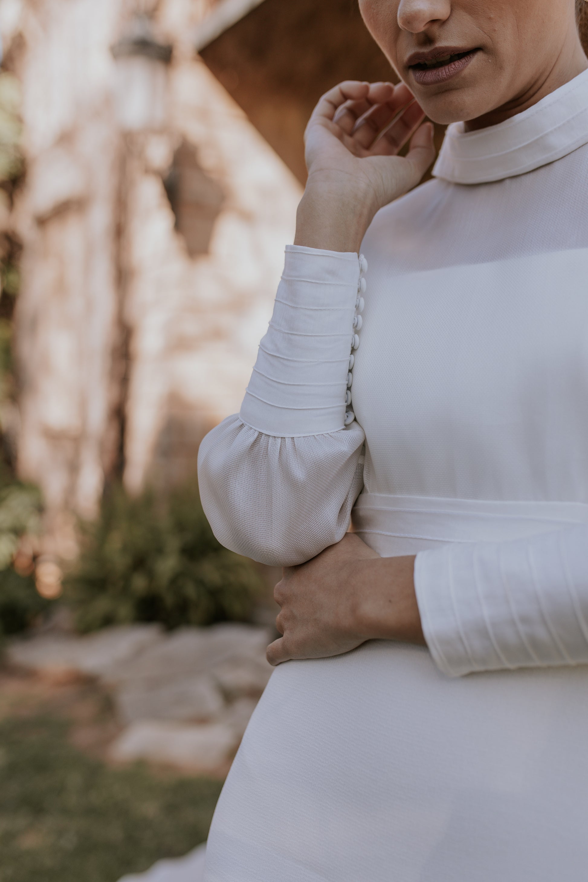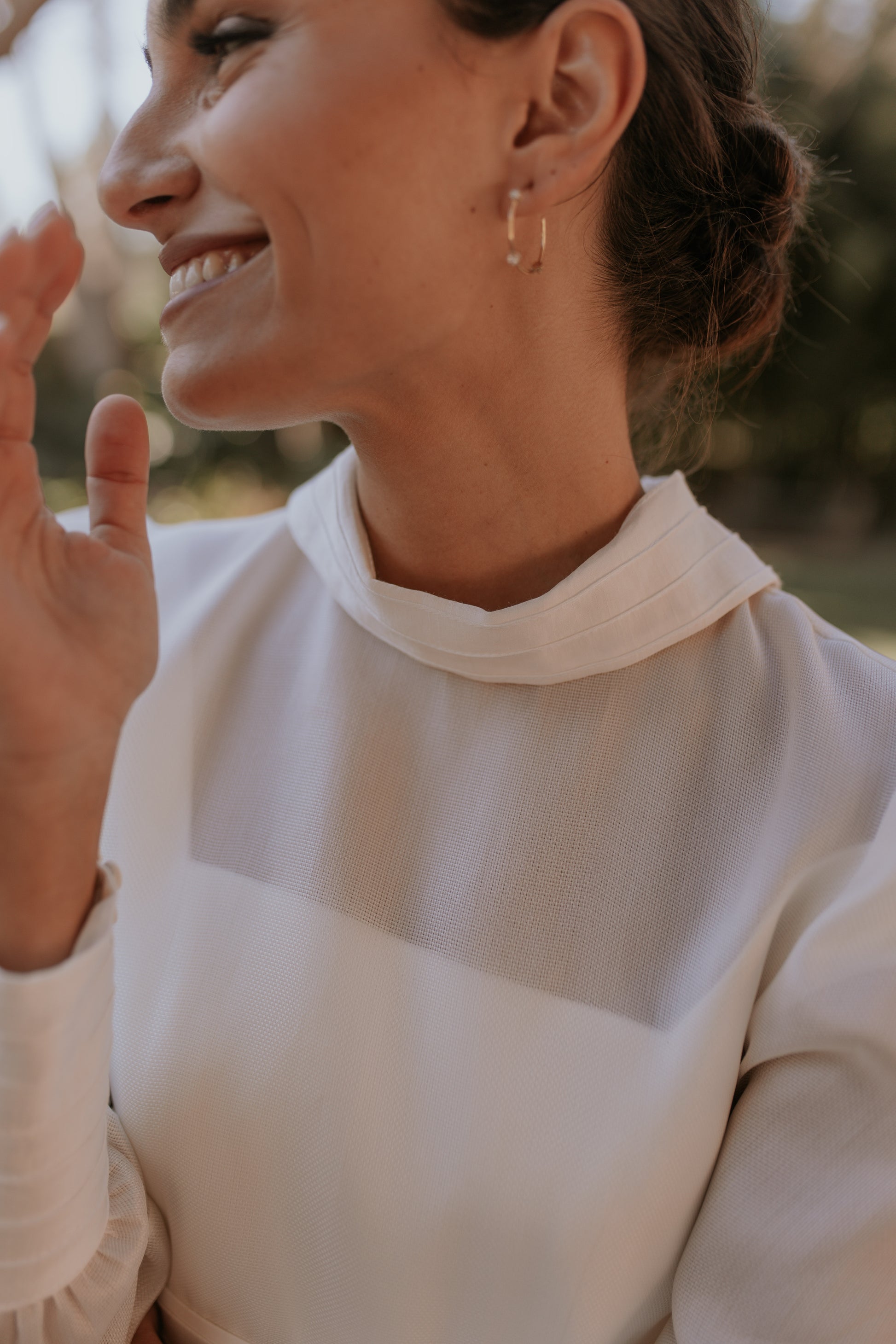 Blusa-capa desmontable confeccionada en una organza rústica de seda natural. Por delante es una blusa con cuello chimenea, mangas abullonadas y cintura ajustada; por detrás es una capa con un fuelle desde el que sale la cola. Detalles de pespuntes en puños y fajín. Botones forrados.