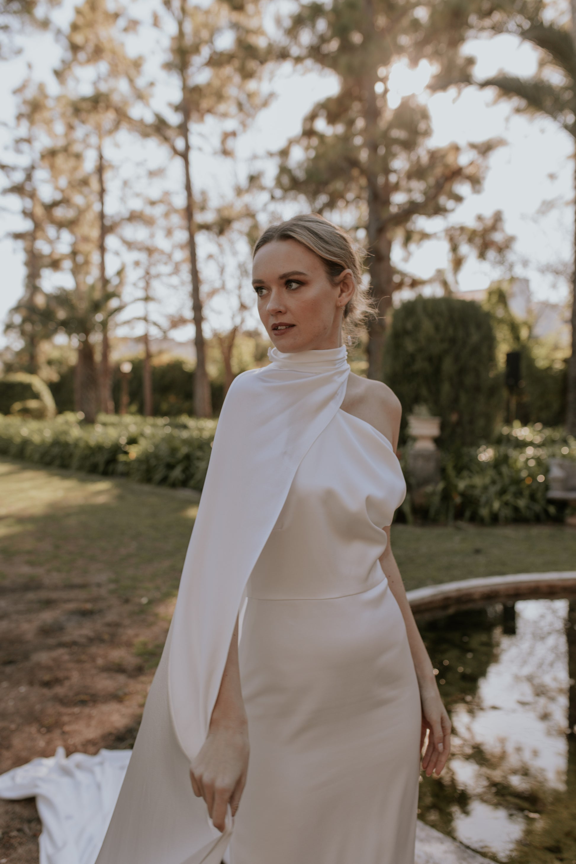 Capa asimétrica abrochada al cuello con tres botones forrados. Confeccionado en satén de seda, lo que aporta un brillo especial al tejido.