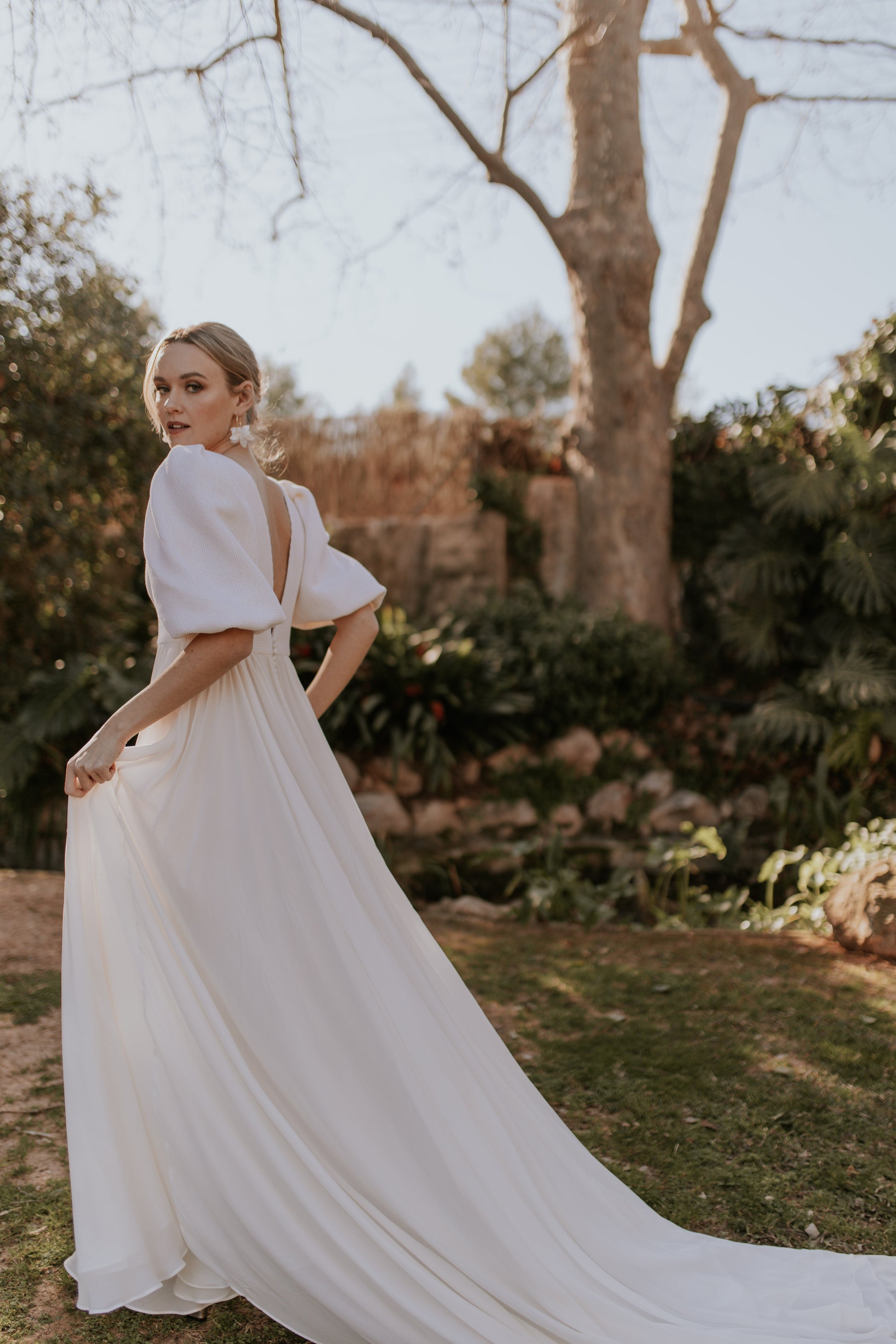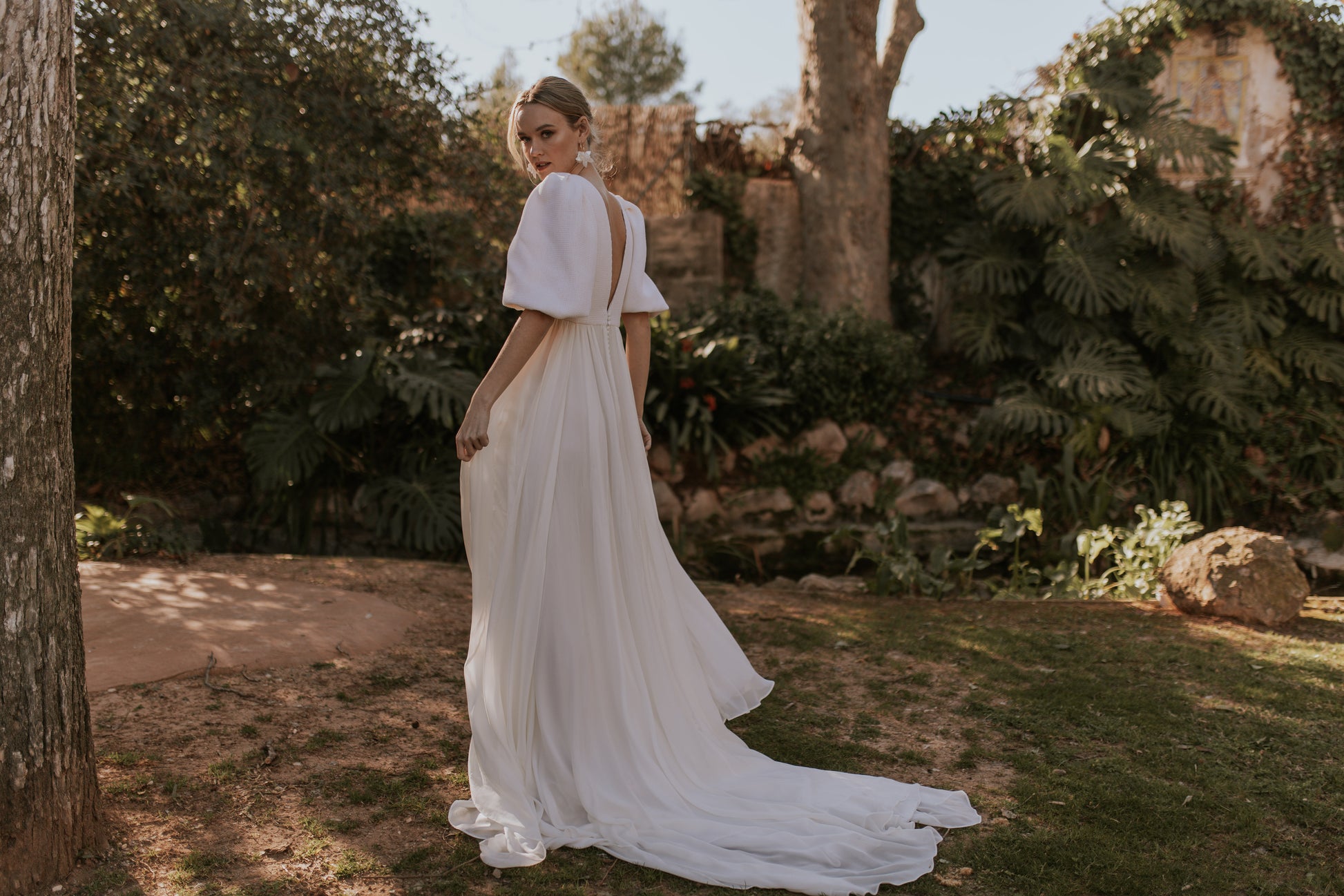 Vestido con falda vaporosa capeada. Parte superior confeccionada en organza trenzada, ambos escotes en forma de pico y falda de varias capas de gasa. Manga corta abullonada. Cola 1 metro.